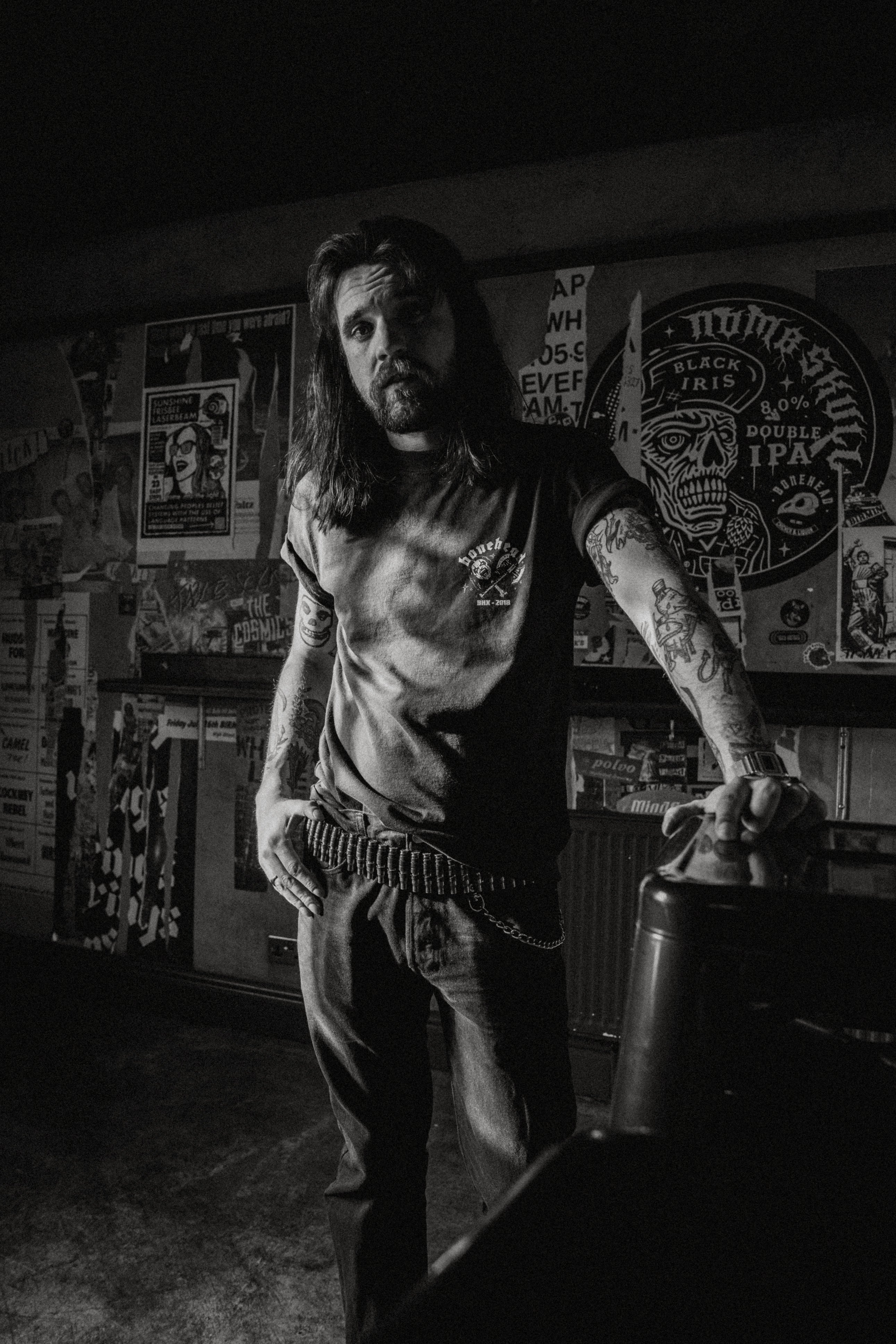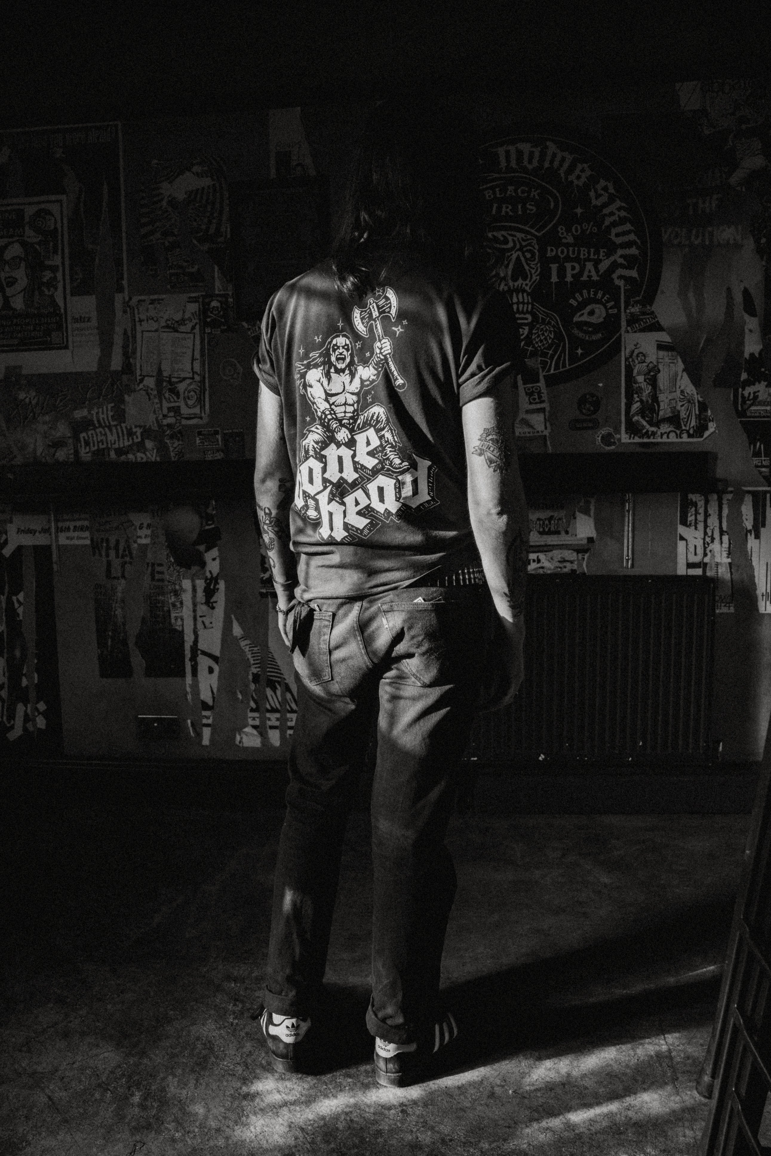 Chest print and larger back print with Bonehead Barbarian character. Printed on a washed black oversized tee. Go for a size down for a regular fit. Artwork by Dirt Wizard.